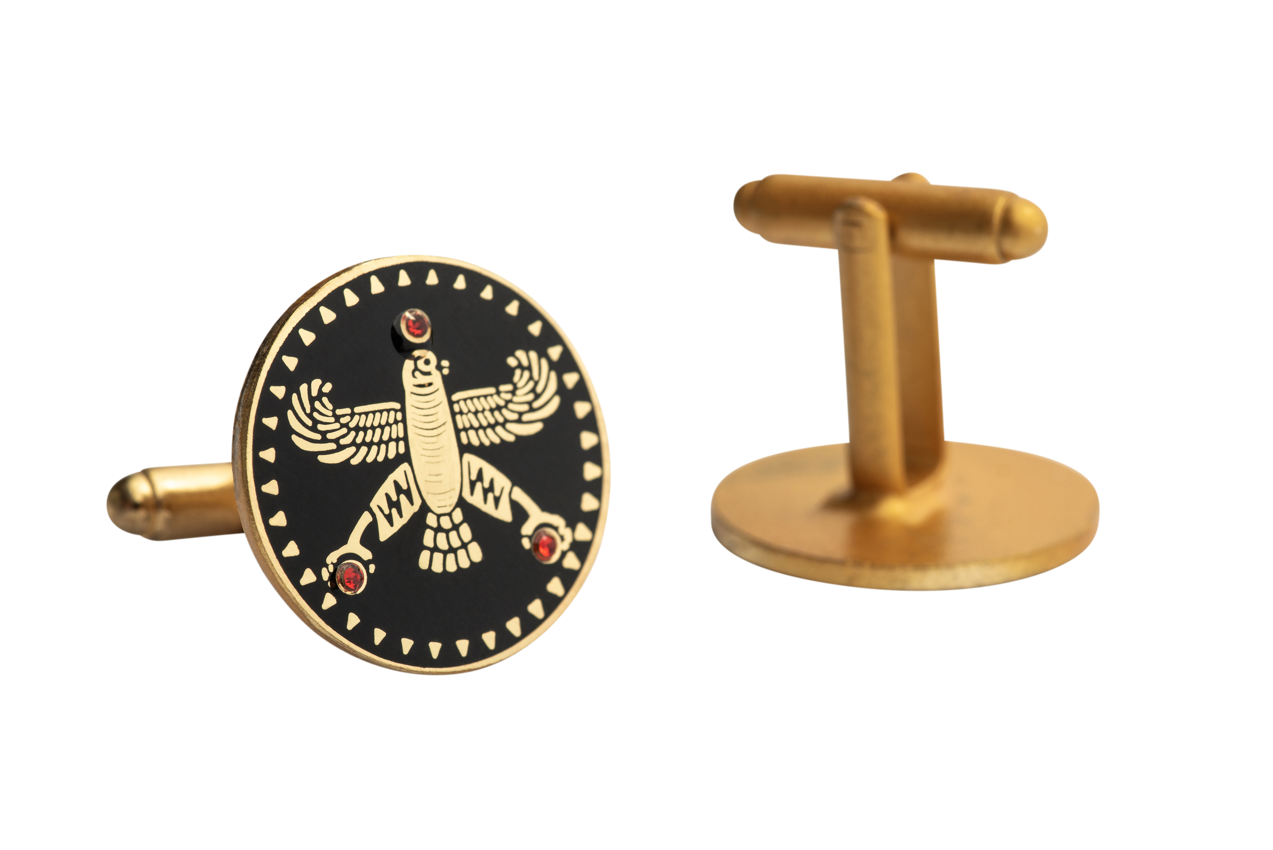 Upgrade your style with the Persian Falcon Enamel Cufflinks, a perfect blend of elegance, heritage, and craftsmanship. Inspired by Cyrus the Great and the Achaemenid era, these gold-plated cufflinks feature a deep black enamel finish with three striking red stones, symbolizing power, wisdom, and nobility.