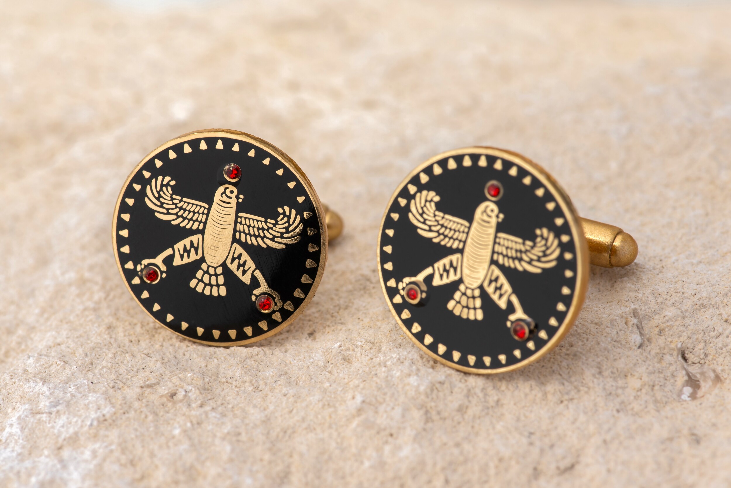 Persian Falcon Cufflinks – Black Enamel with 3 Red Stones