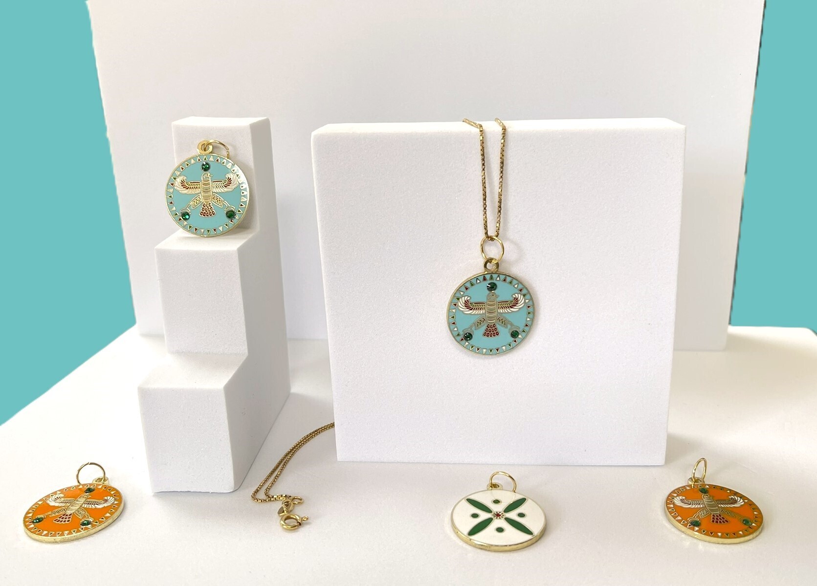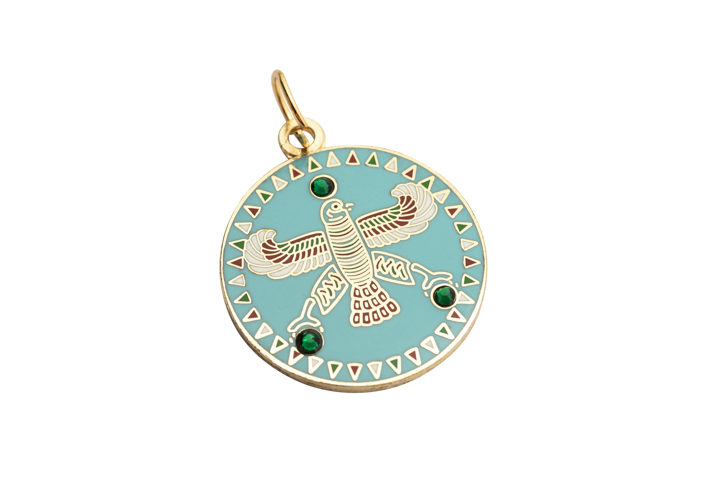 Round Pendant. The Persian Falcon. Blue Turquoise with 3 Green Stones.