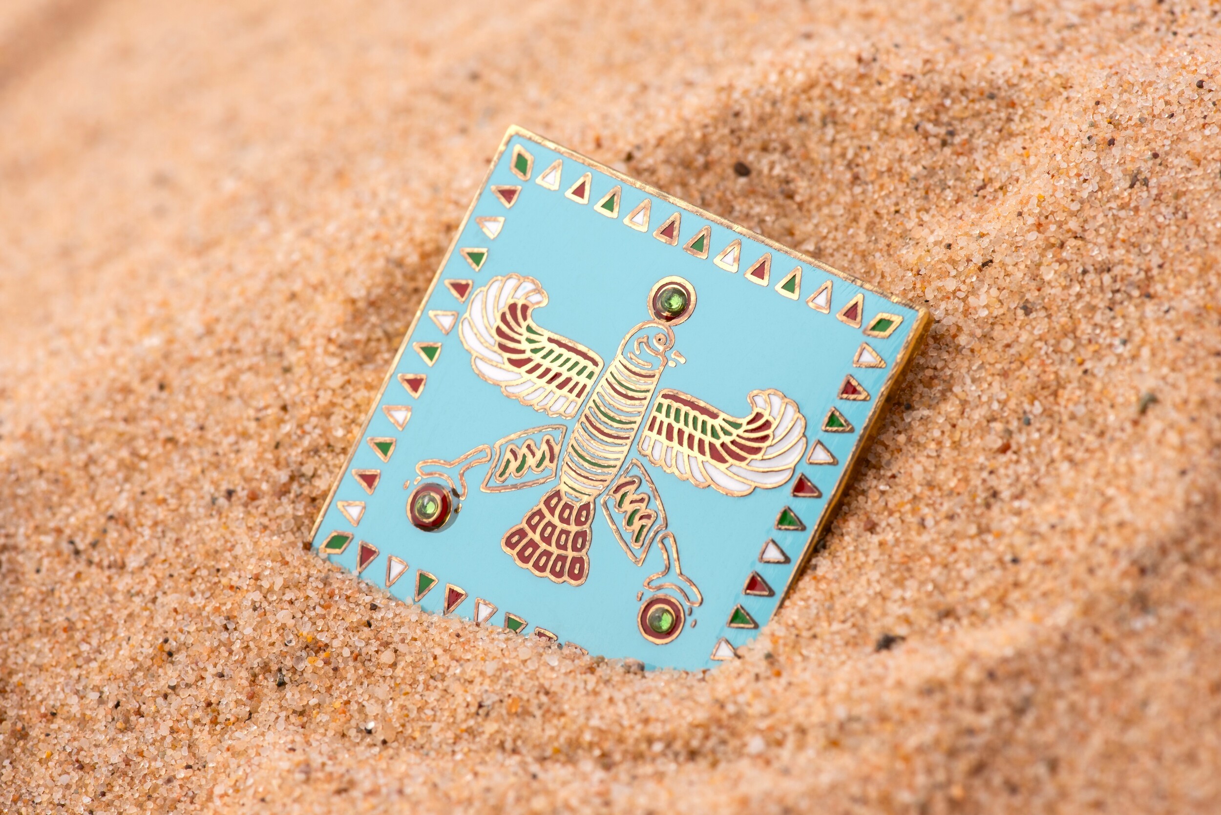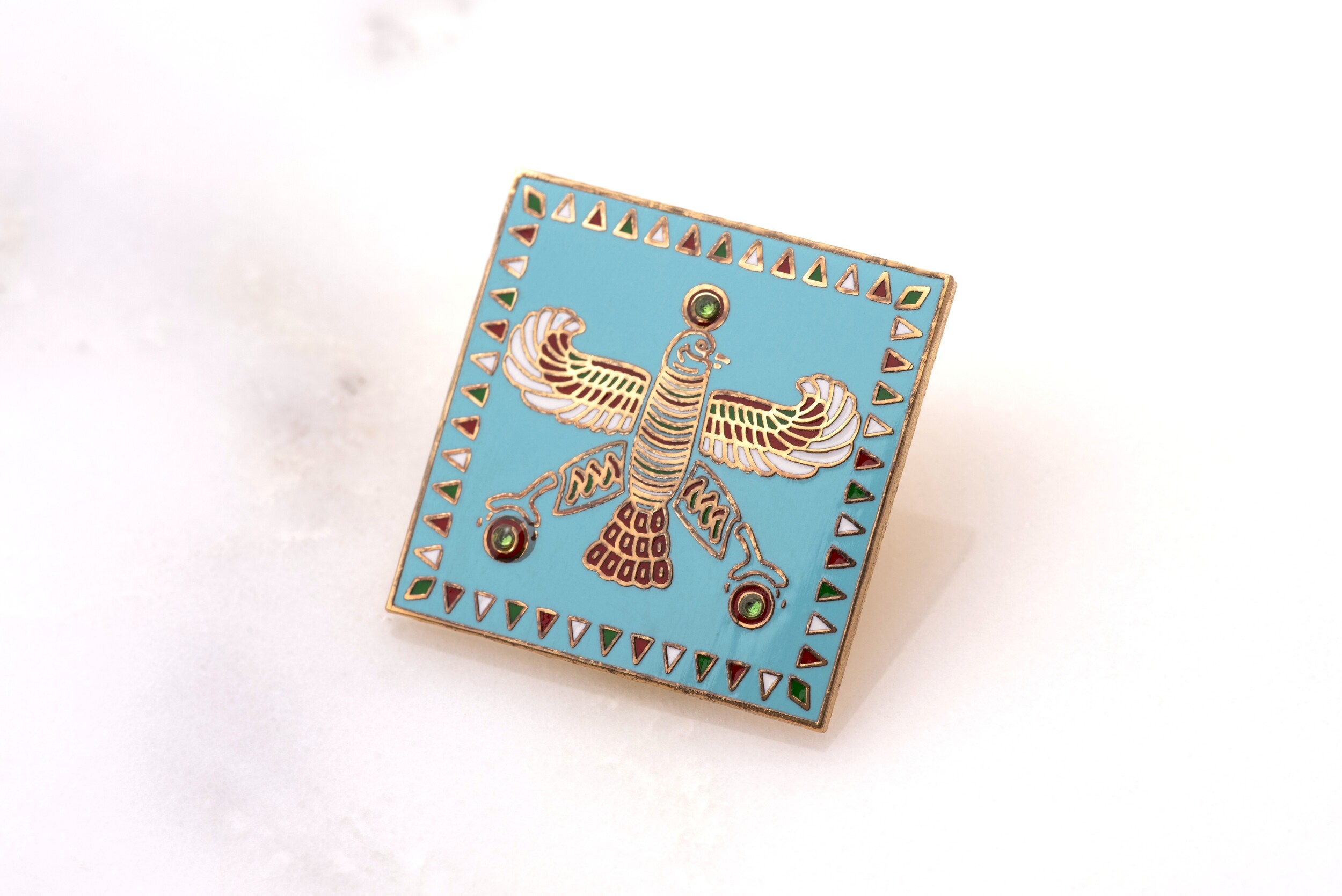 The Persian Falcon Enamel Badge – Blue Turquoise with 3 Green Stones