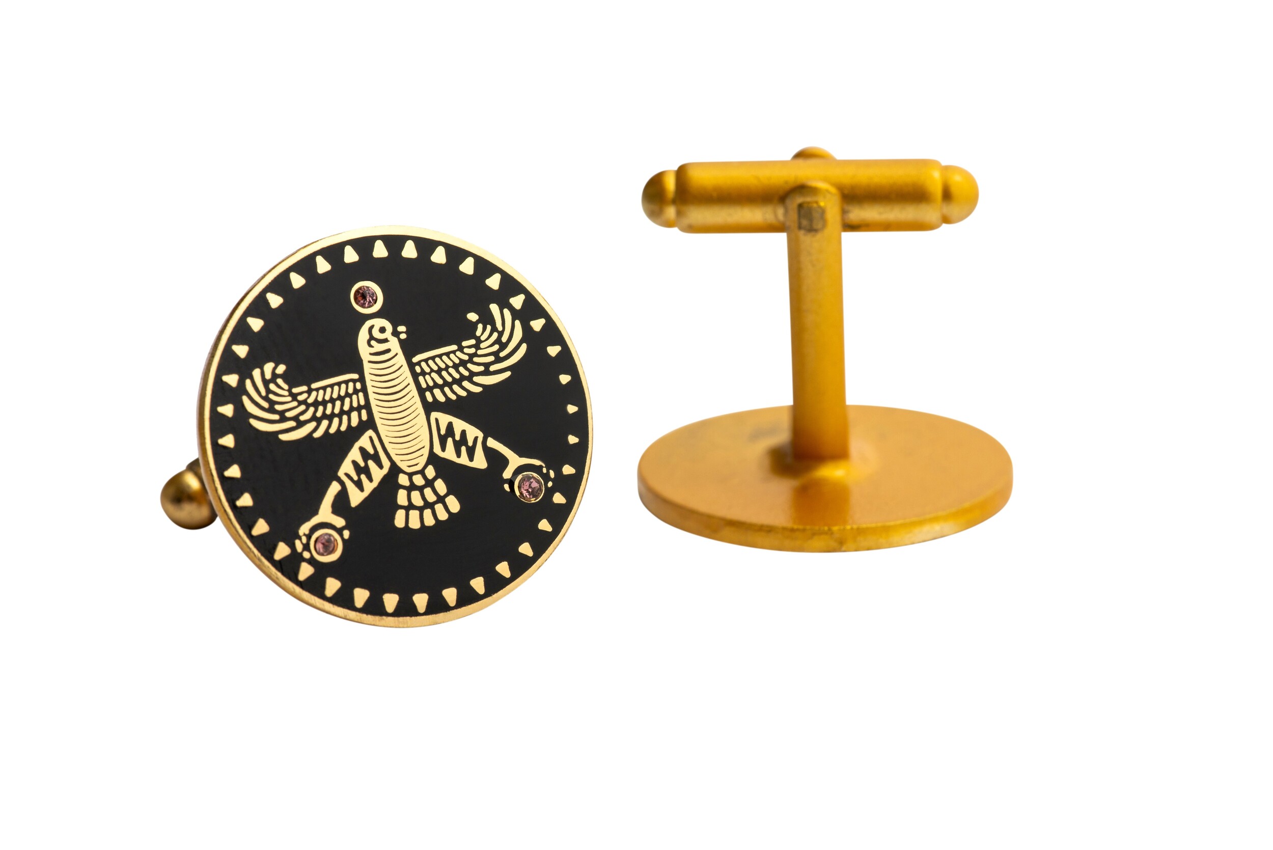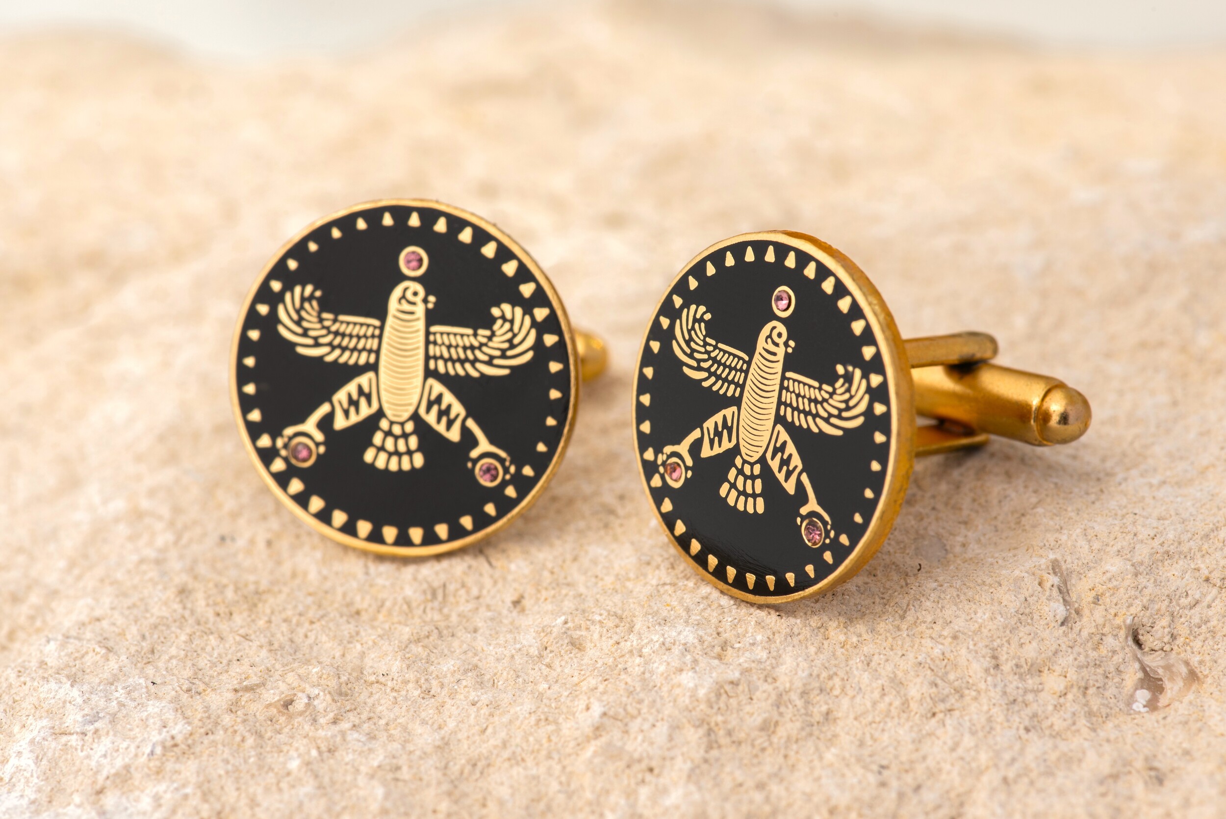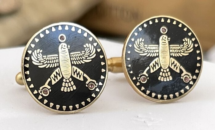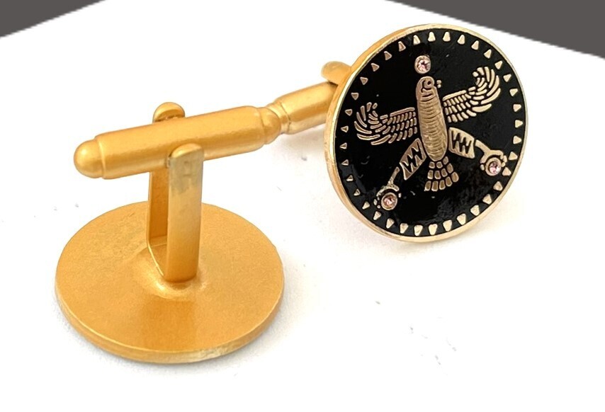 Upgrade your style with the Persian Falcon Enamel Cufflinks, a perfect blend of elegance, heritage, and craftsmanship. Inspired by Cyrus the Great and the Achaemenid era, these gold-plated cufflinks feature a deep black enamel finish with three striking white stones, symbolizing power, wisdom, and nobility.