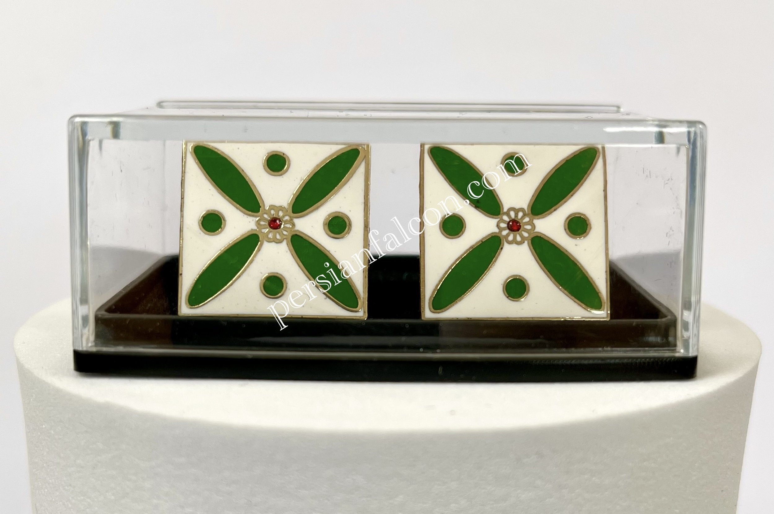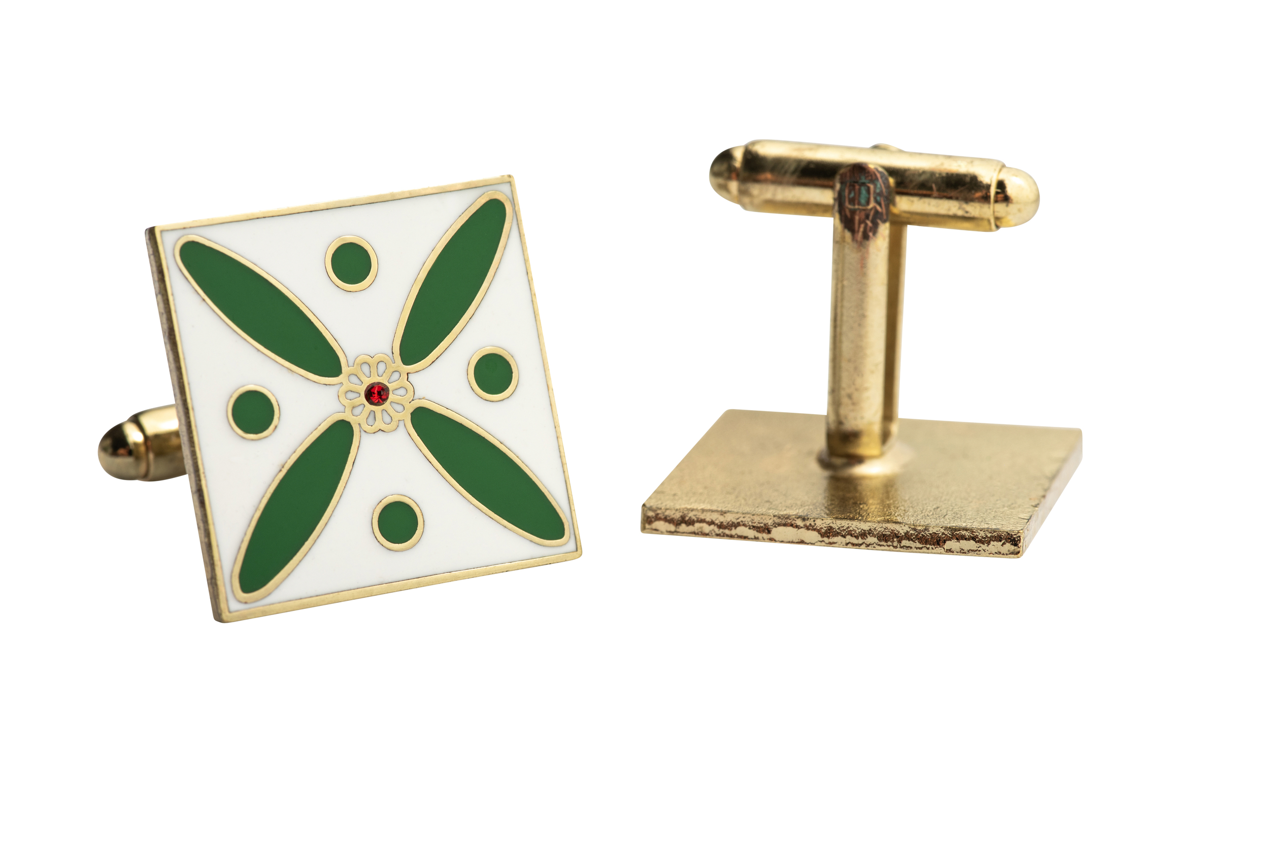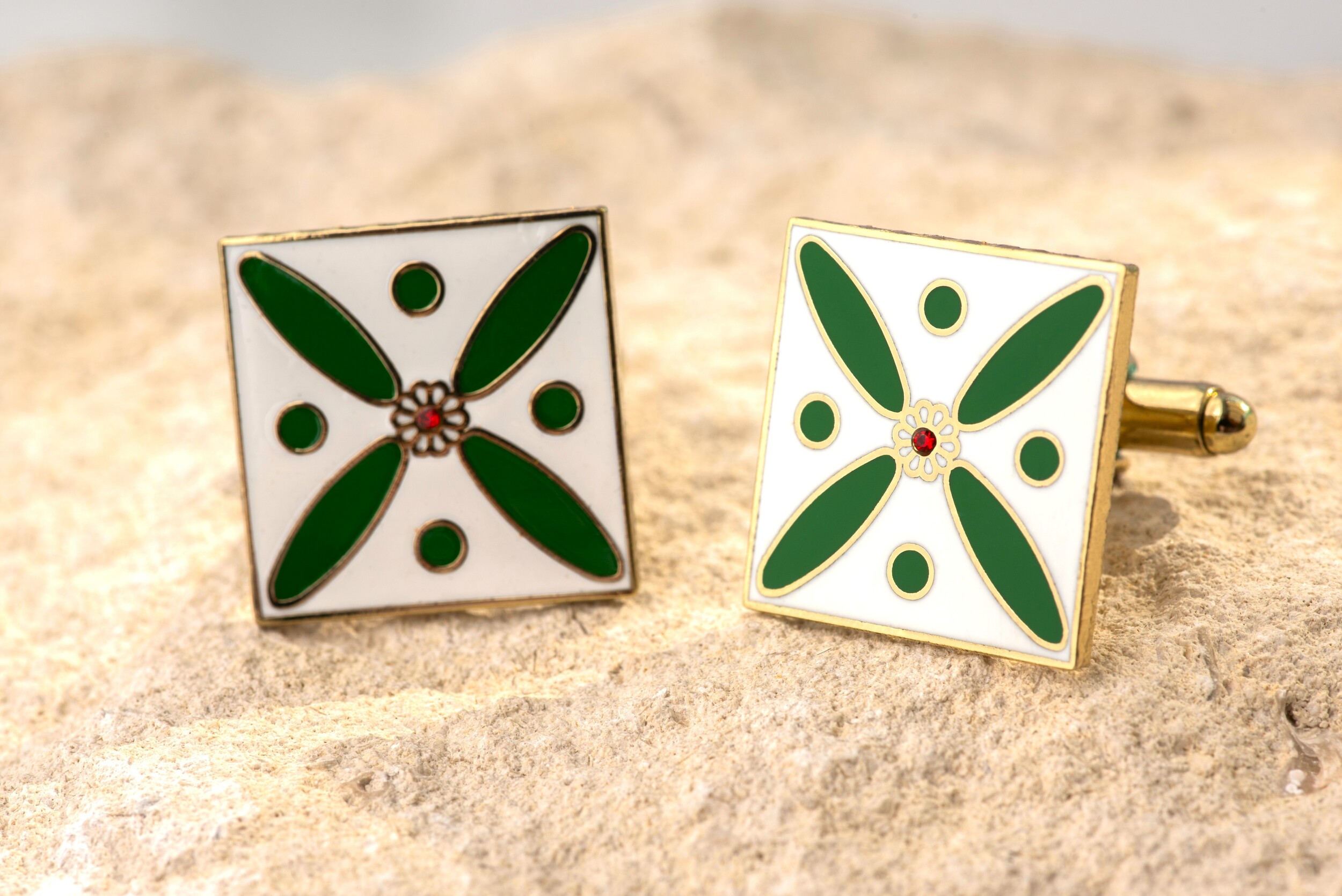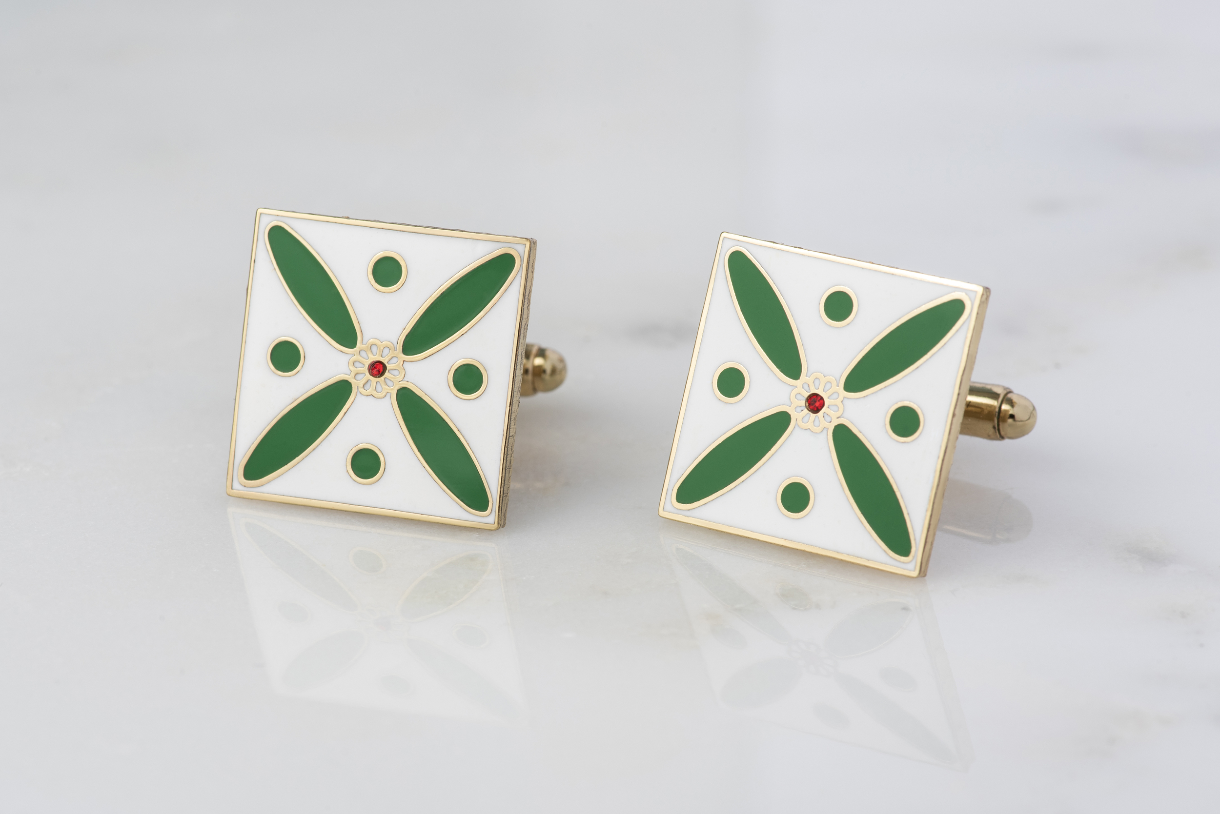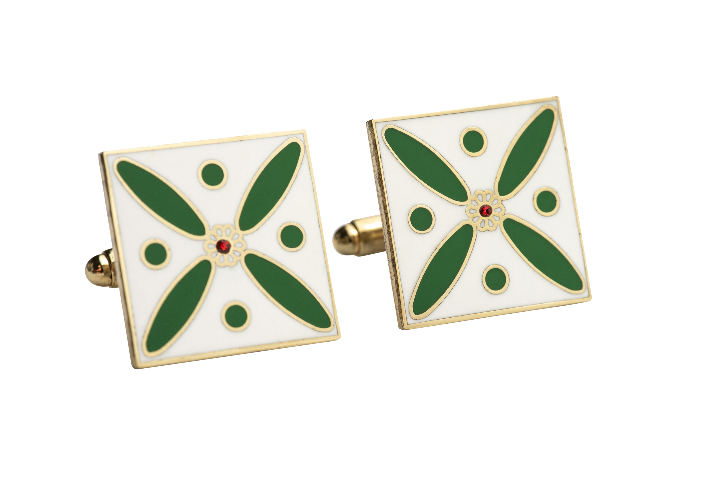 Cufflinks. The Persian Cross. Green on White with 1 Central Red Stone.