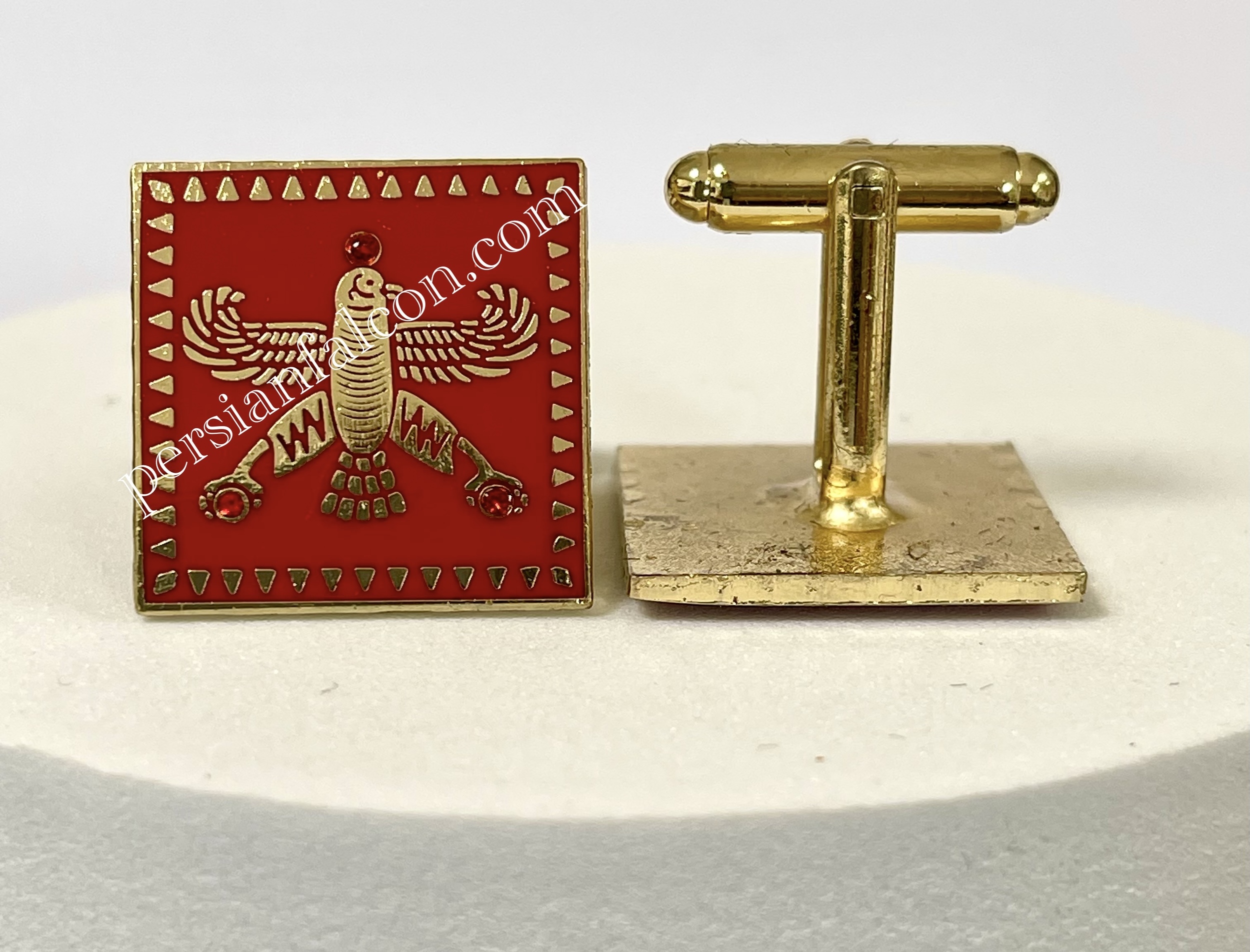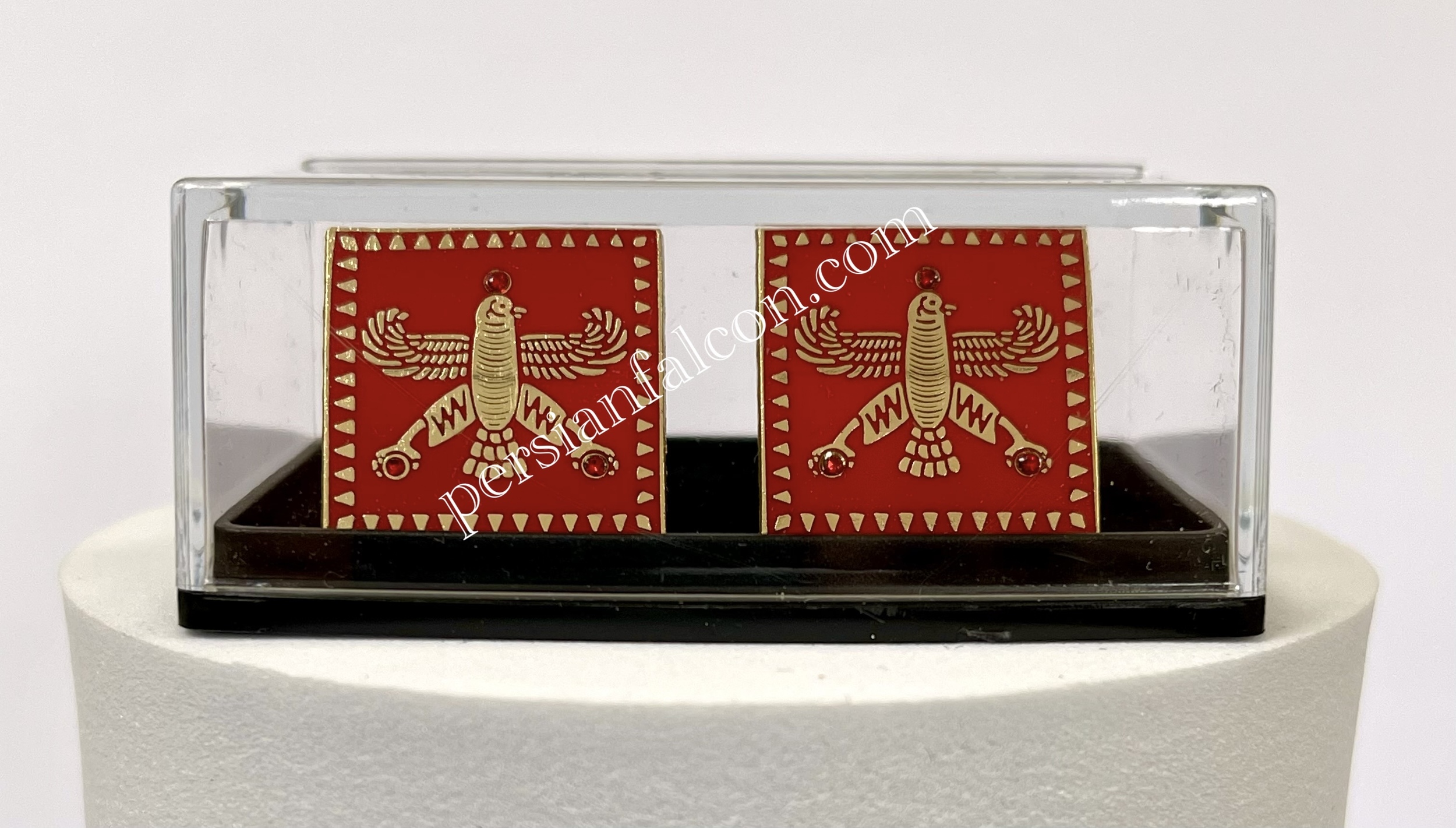 Upgrade your style with the Persian Falcon Enamel Cufflinks, a perfect blend of elegance, heritage, and craftsmanship. Inspired by Cyrus the Great and the Achaemenid era, these gold-plated cufflinks feature a deep red enamel finish with three striking red stones, symbolizing power, wisdom, and nobility.