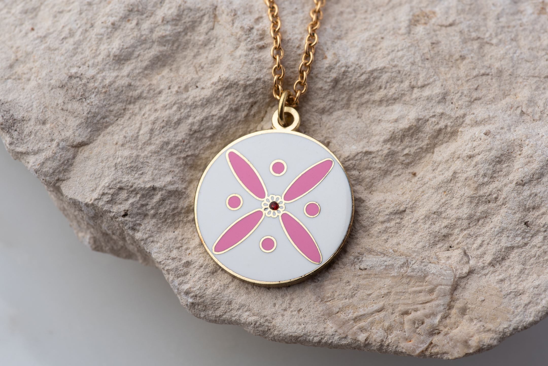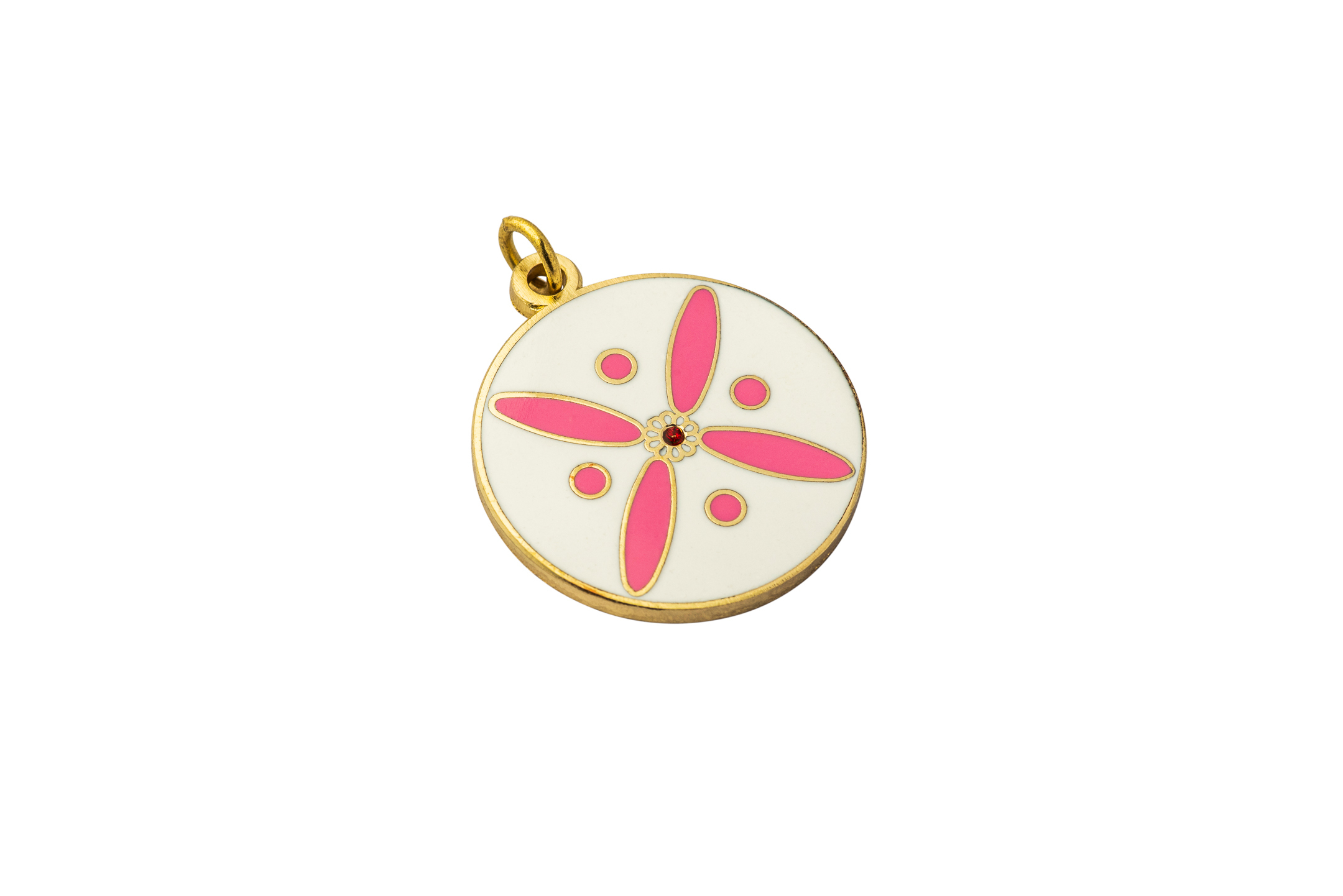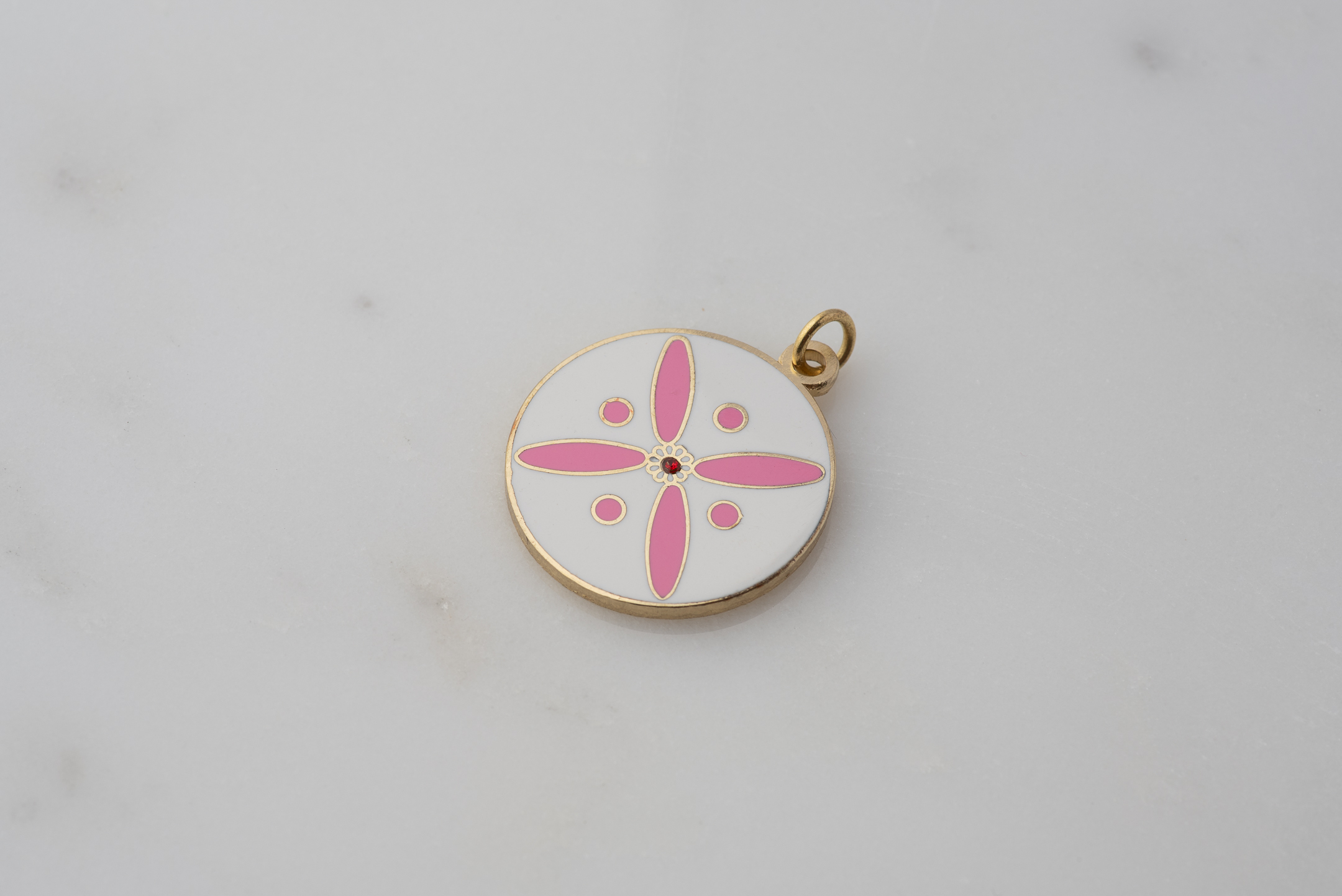 Round Pendant. The Persian Cross. Deep Pink on White with 1 Central Red Stone.