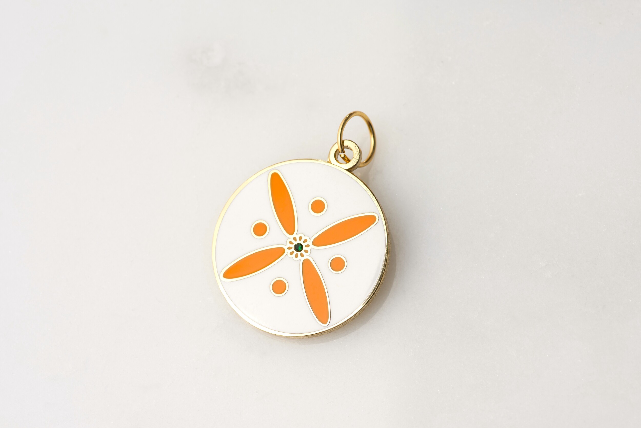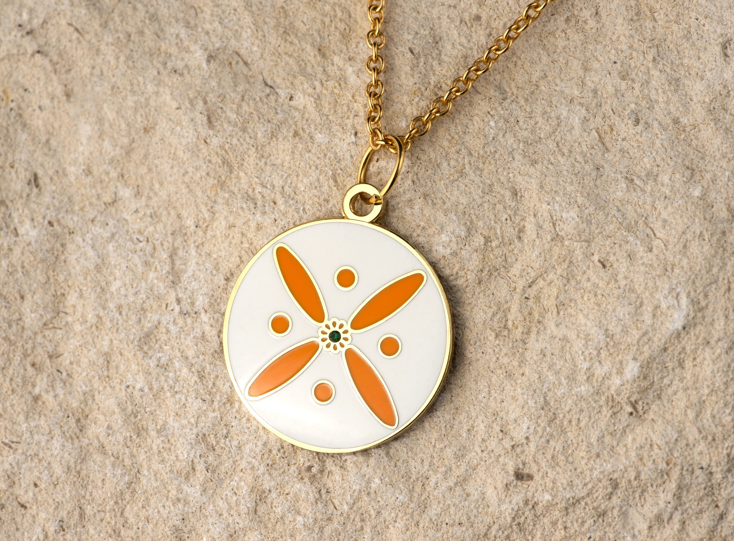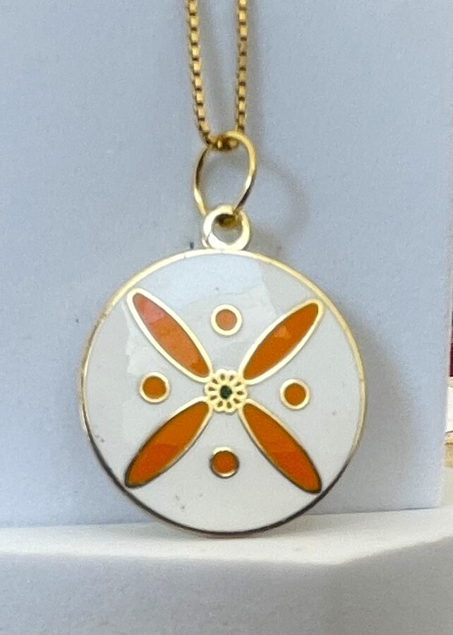 Round Pendant. The Persian Cross. Orange on White with 1 Central Green Stone.