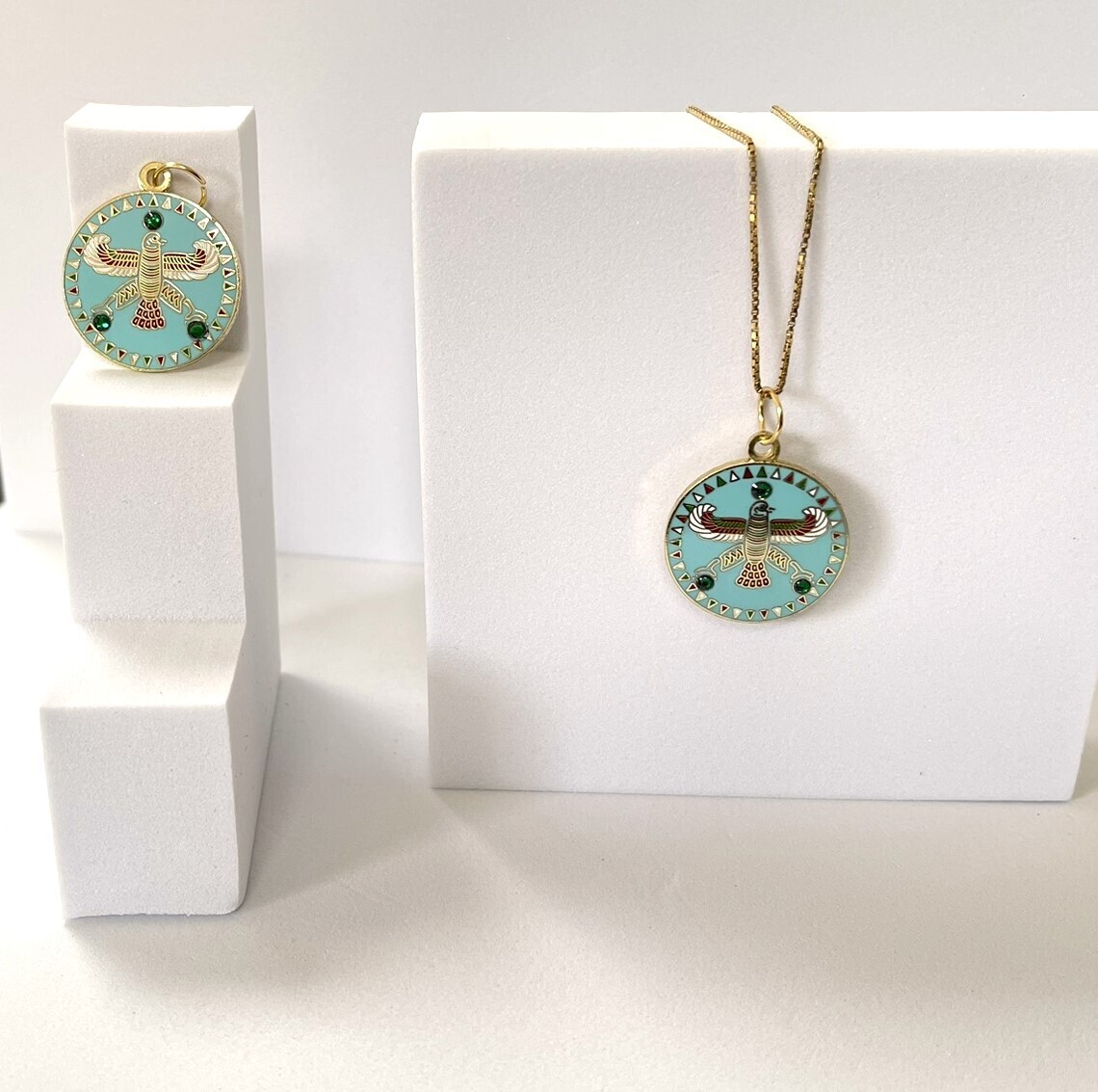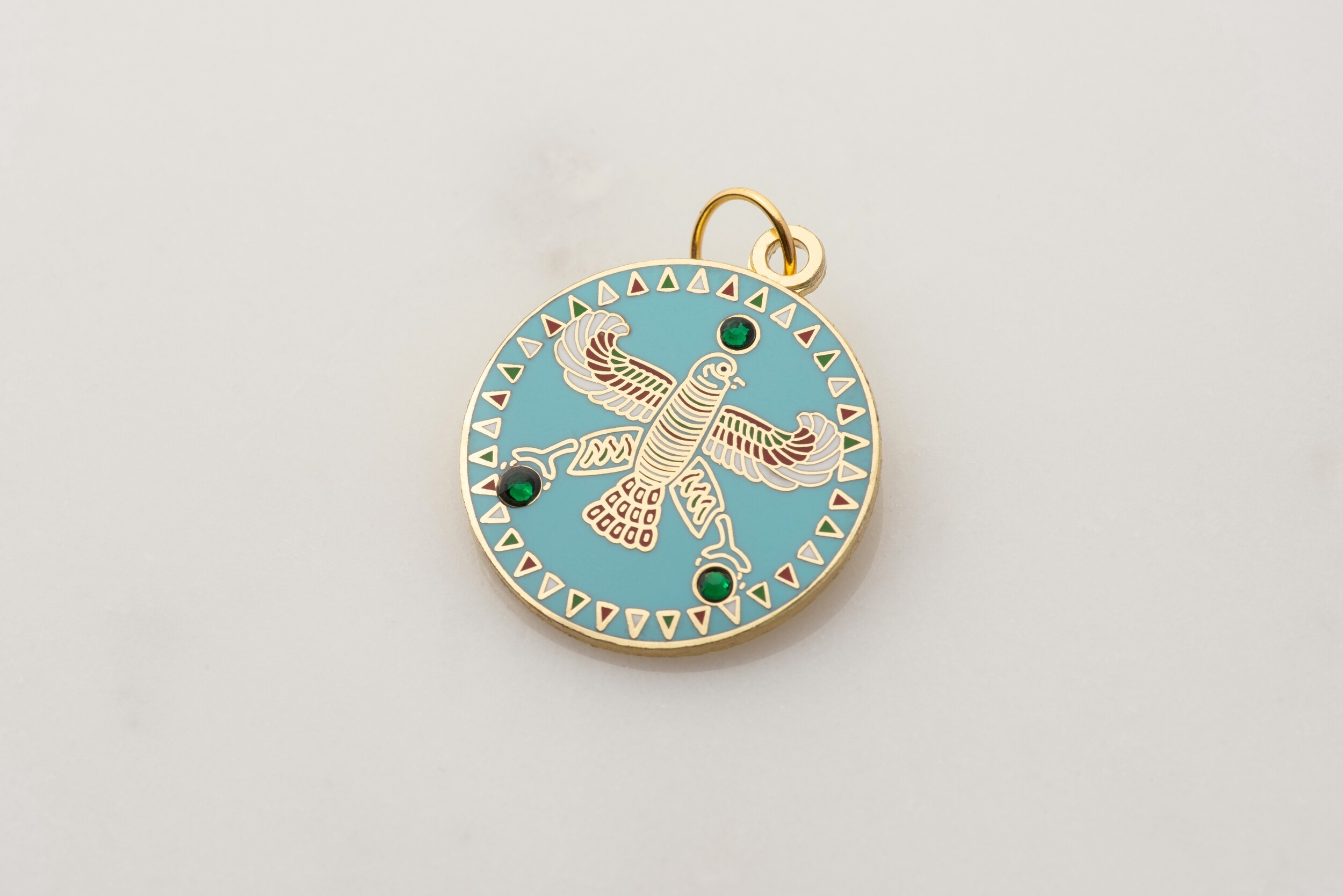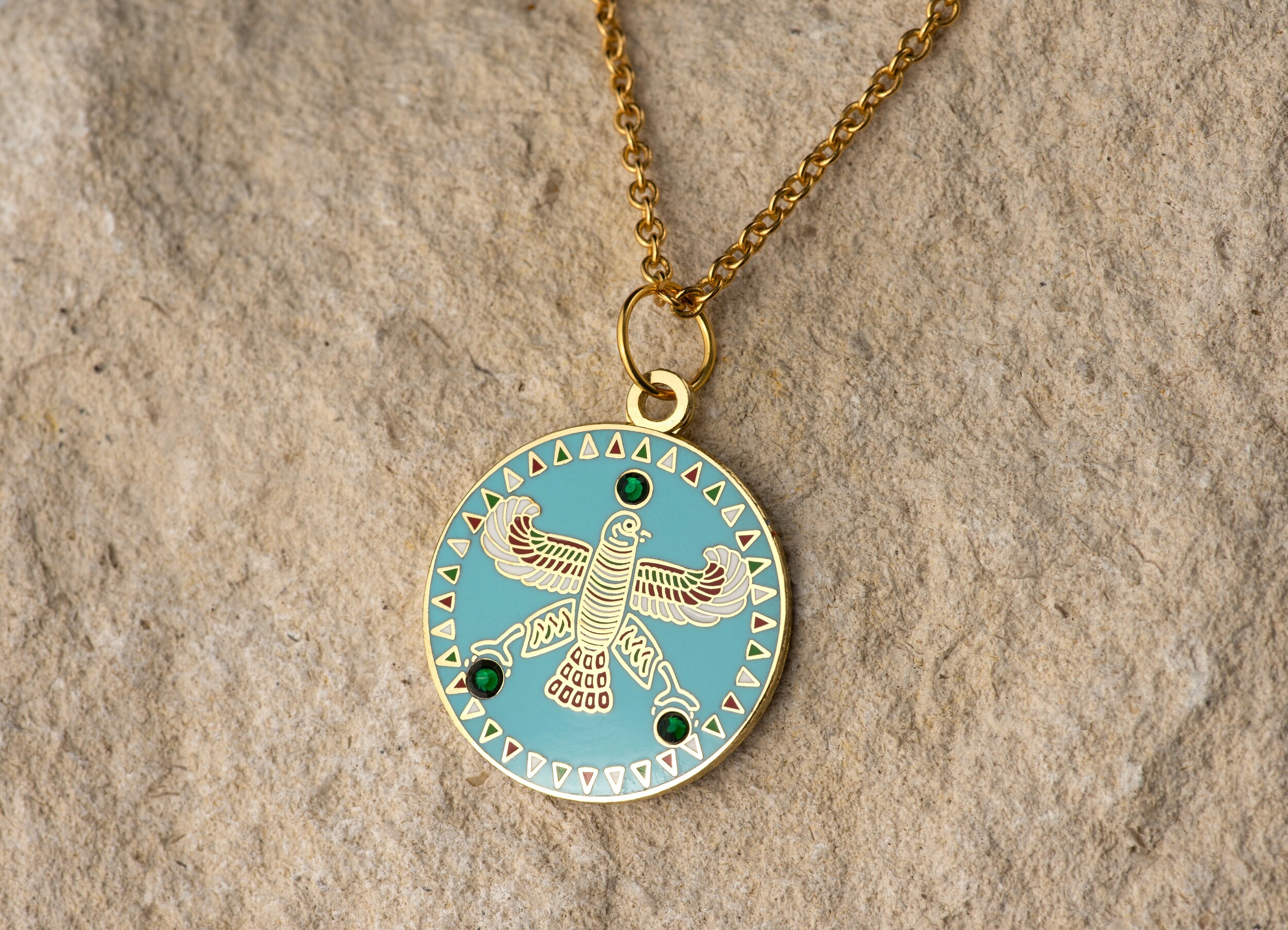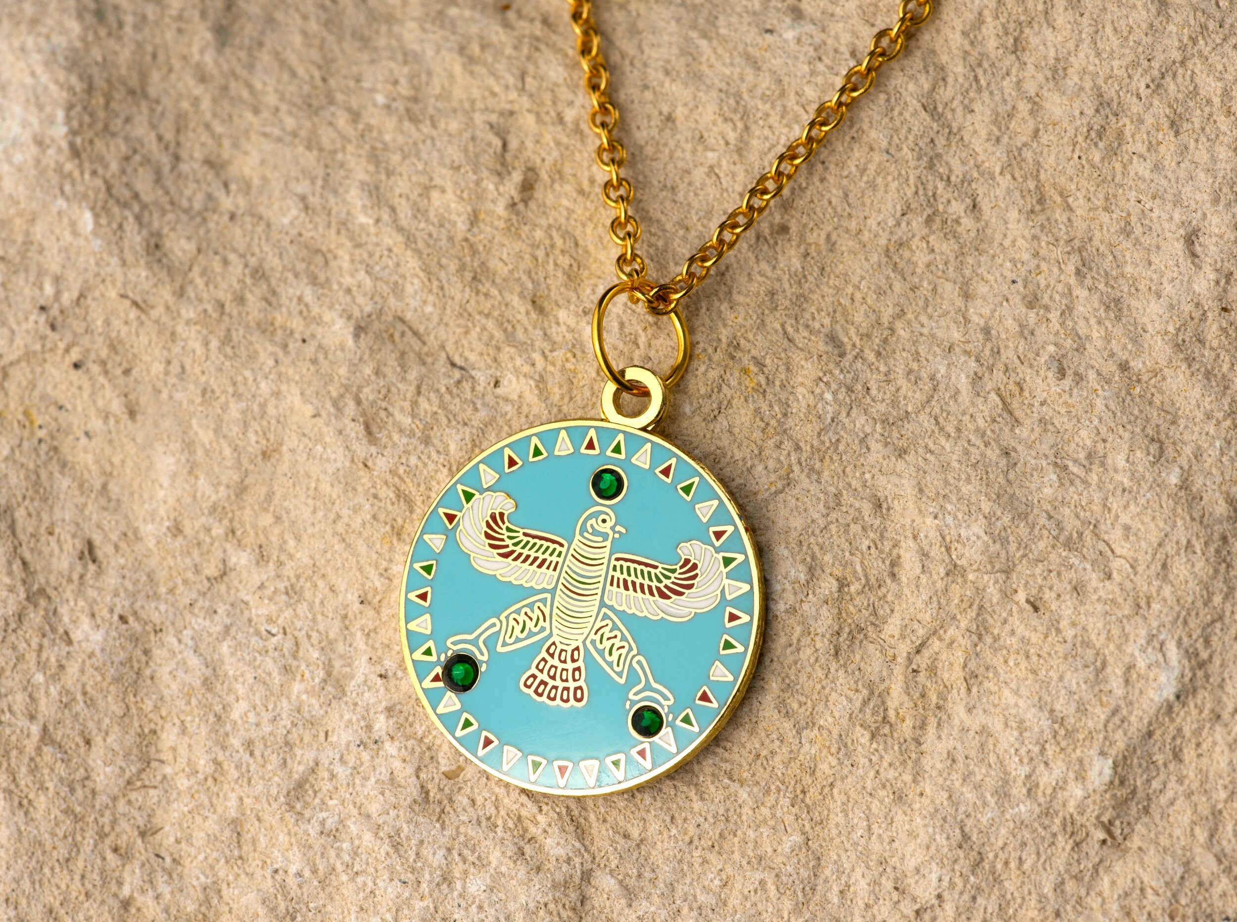 Round Pendant. The Persian Falcon. Blue Turquoise with 3 Green Stones.
