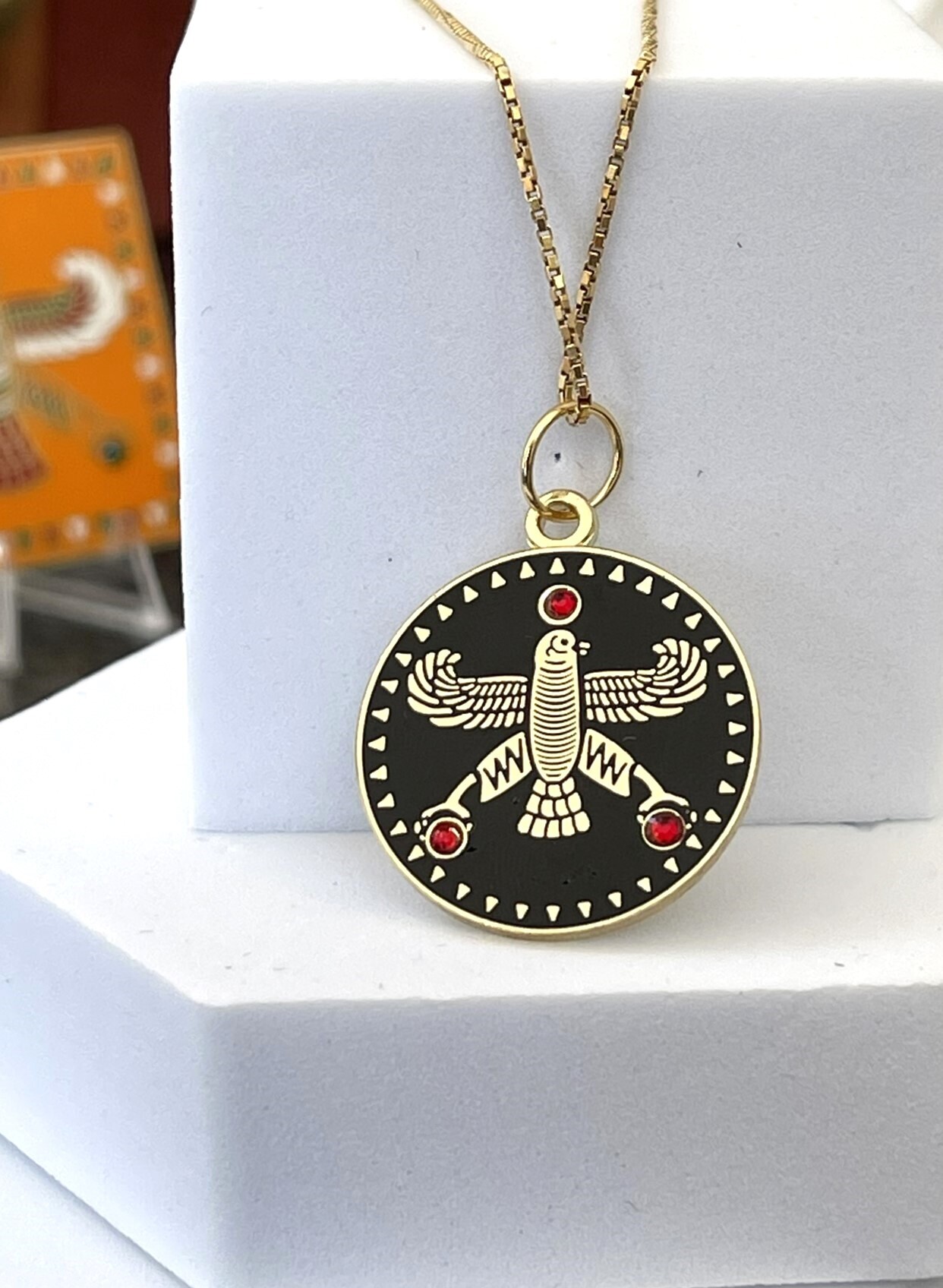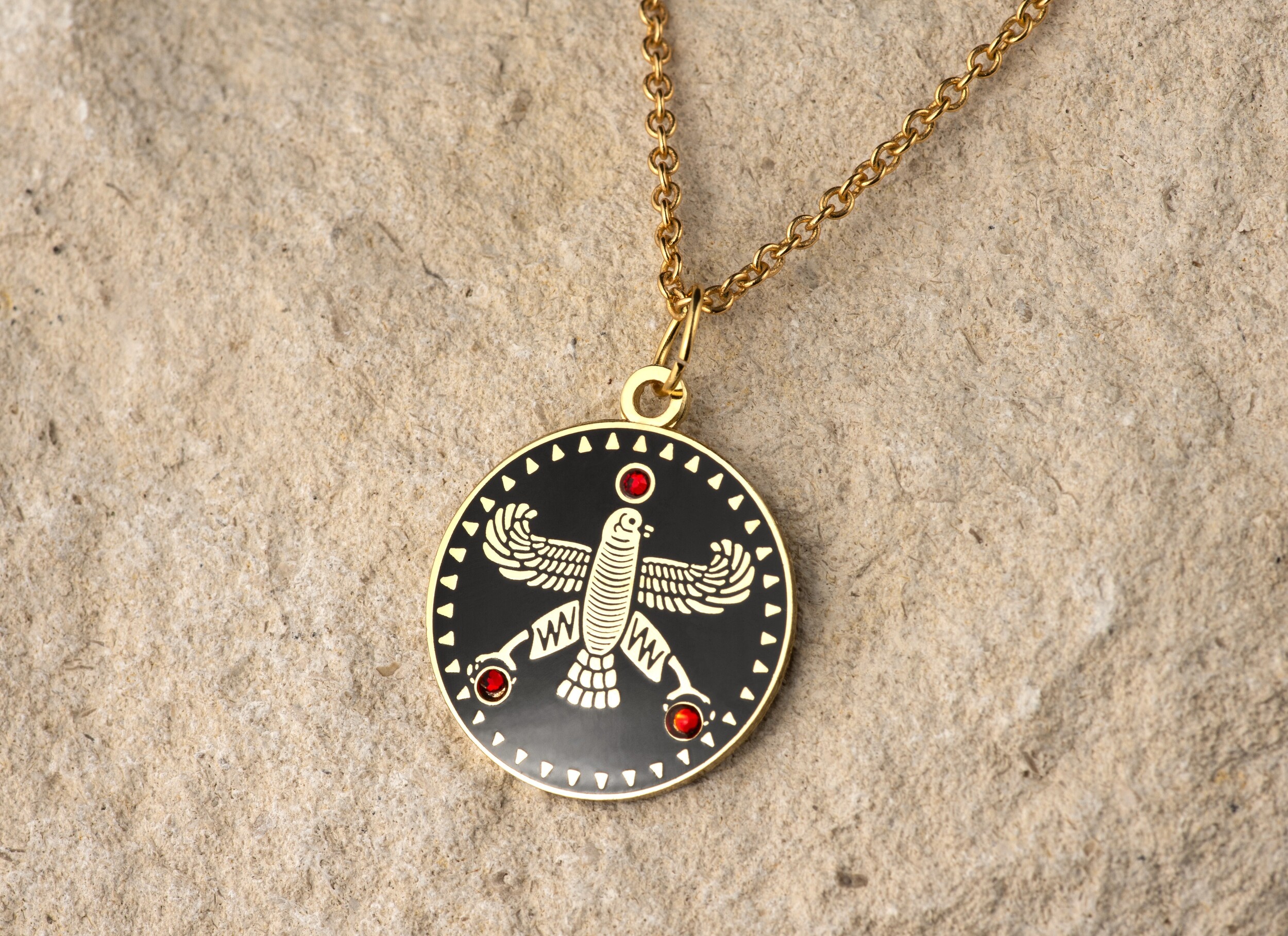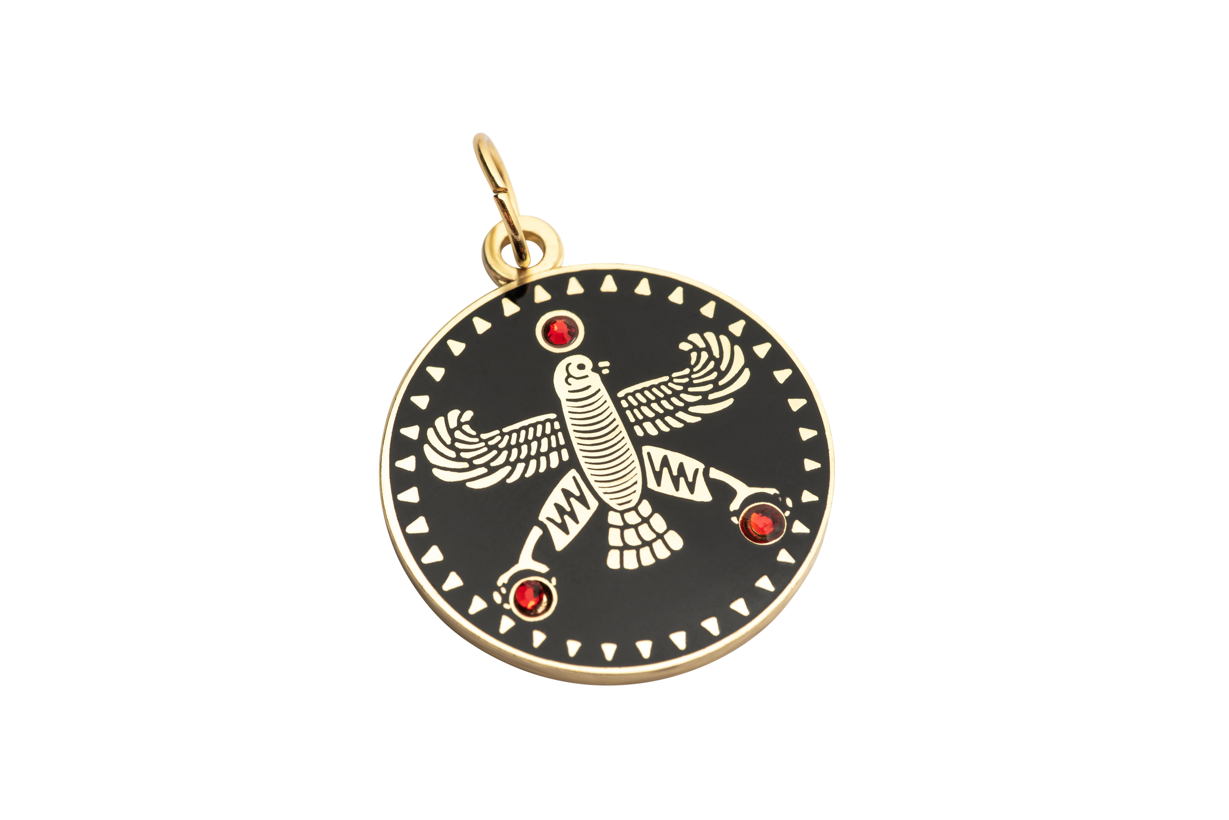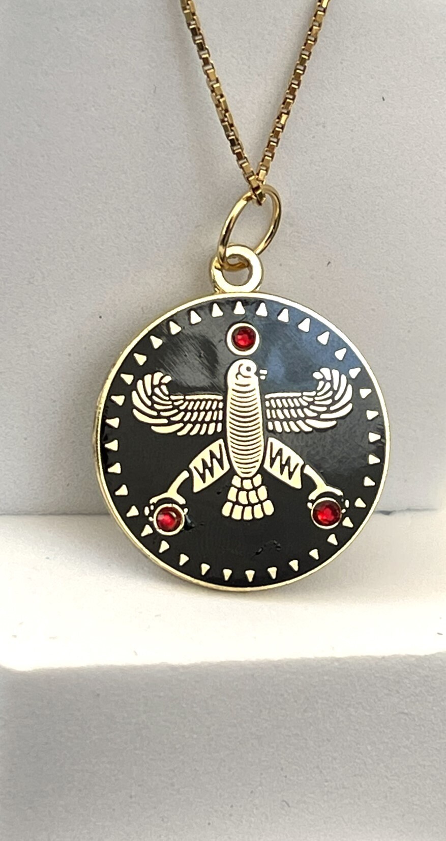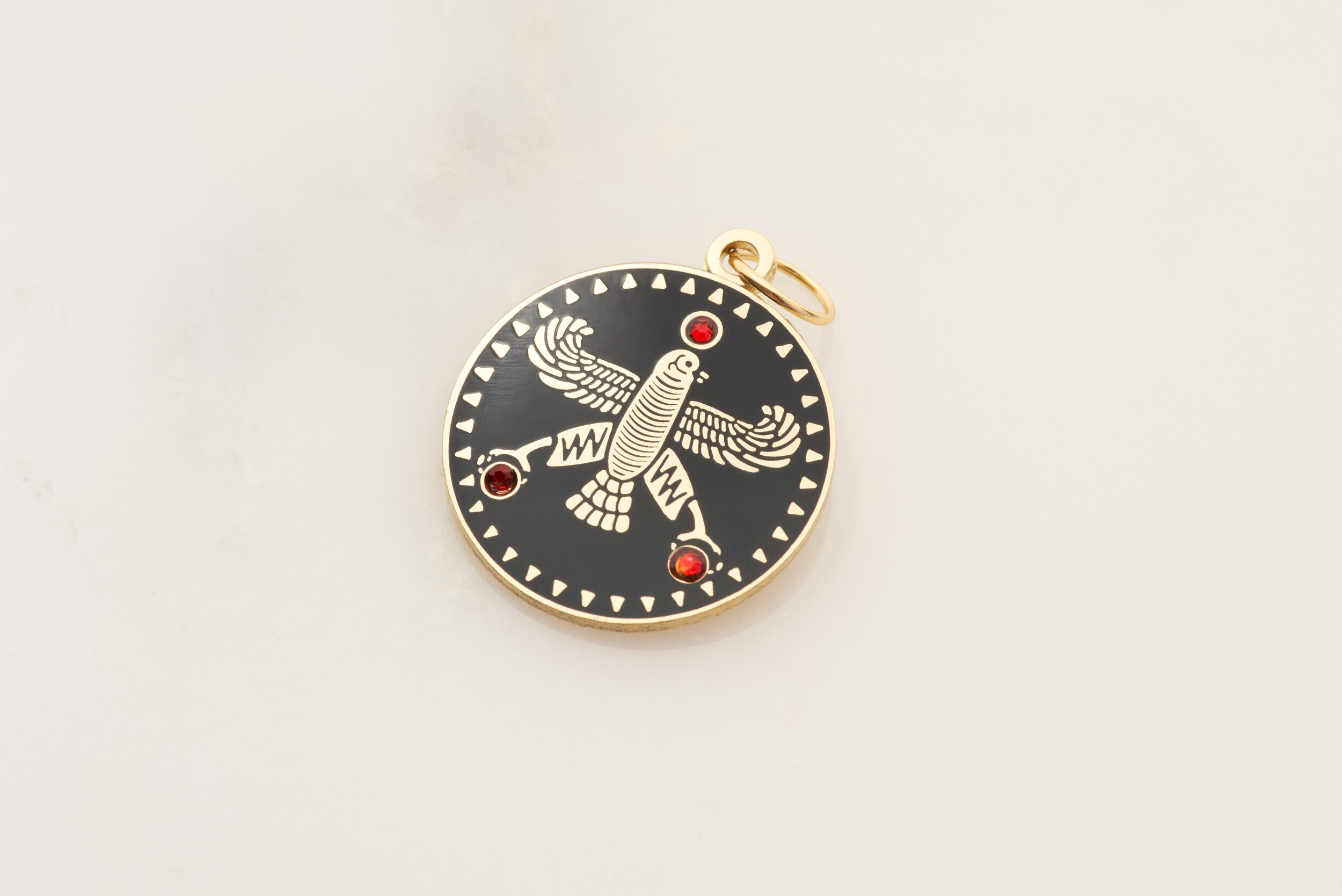 Round Pendant. The Persian Falcon. Black with 3 Red Stone.