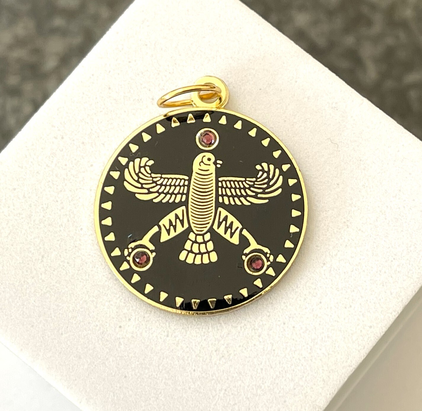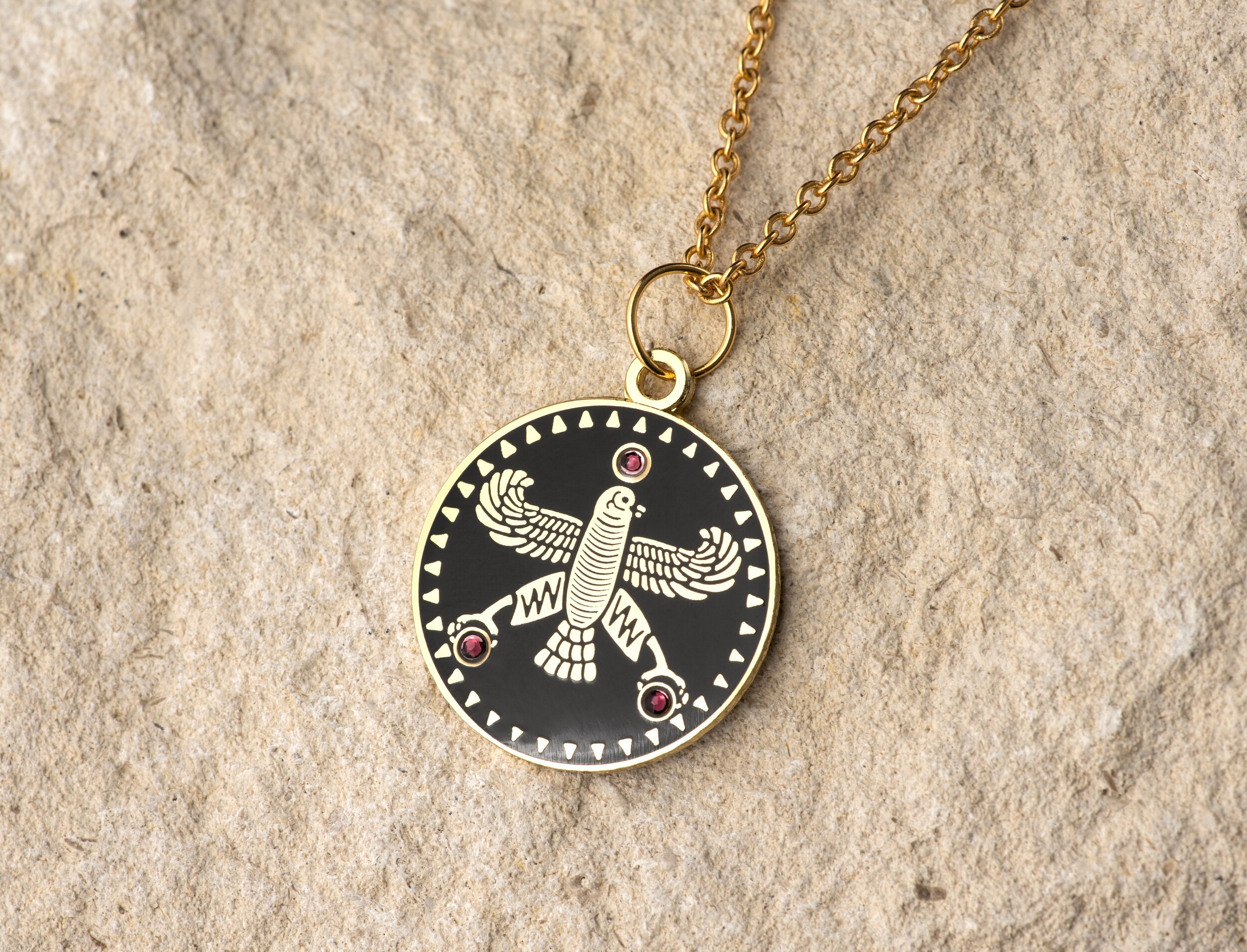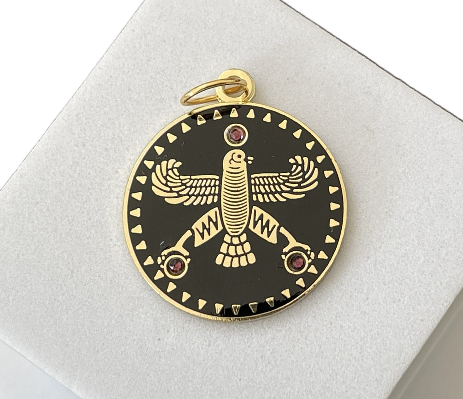 Round Pendant. The Persian Falcon. Black with 3 White Stones.
