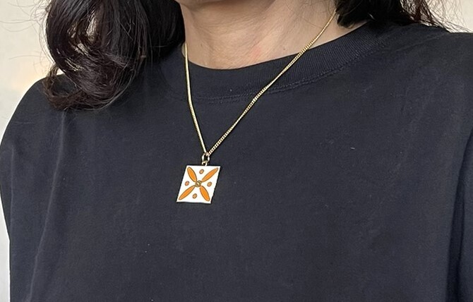 The Persian Cross. Orange on White with 1 Central Non-precious Green Stone. Pendant.